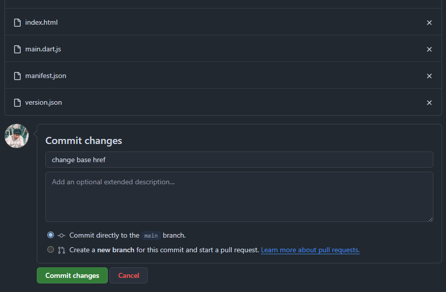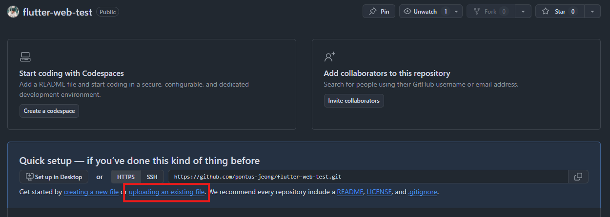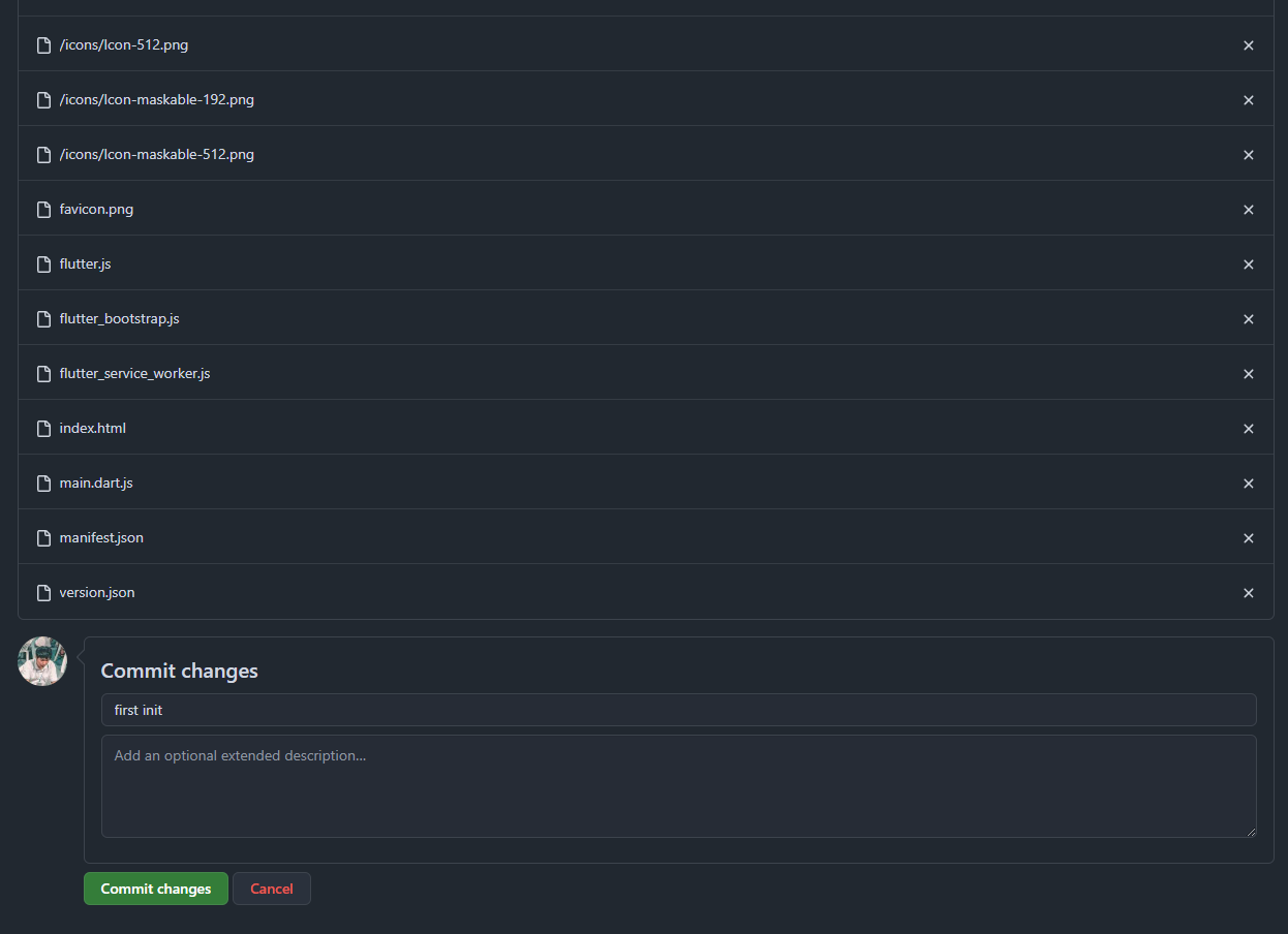 원래대로라면 build/web 폴더를 git을 이용해 push를 하는 게 맞지만, 다음 포스팅에서 flutter 프로젝트 전체를 git으로 push를 할 예정이라 이번 포스팅에서만 file을 직접 업로드하겠습니다.