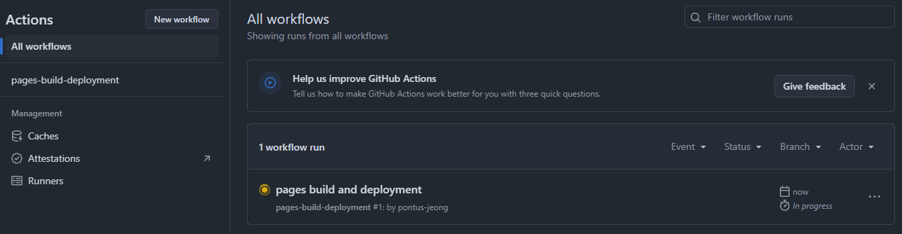 그러면 자동으로 Github에서 deploy를 해주는데 Actions탭을 누르면 다음 사진과 같이 진행 과정이 보입니다.