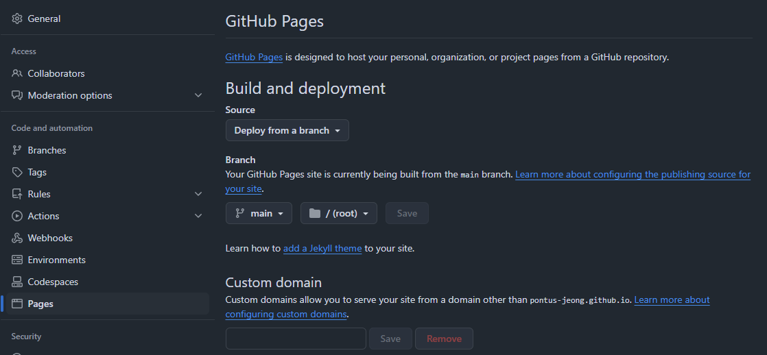 이렇게 하면 자동으로 Github Pages가 세팅되는 건 아니기에 Github Pages 세팅을 해줍니다.