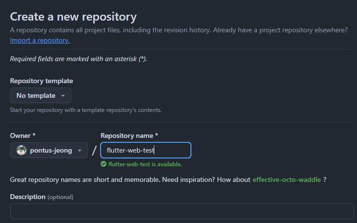저의 경우에는 레포지토리명이 flutter-web-test이기에 다음과 같이 입력하시면 됩니다.
