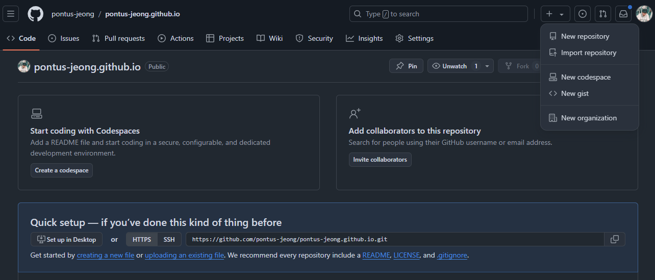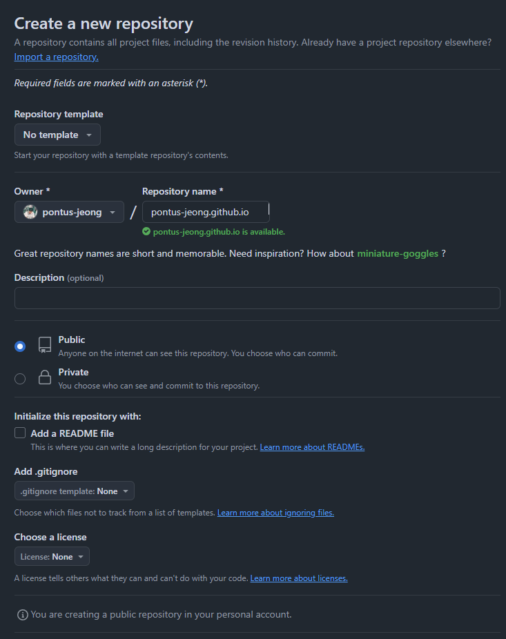 Github 계정이 있다면 Github 홈페이지에 Create New Repository 들어가서 옆의 Owner이름을 참고하여 "{Owner이름}.github.io"로 Repository name을 만들고 그 외 추가 세팅 없이 Create Repository 버튼을 눌러 새로운 Repository를 만들어줍니다.
