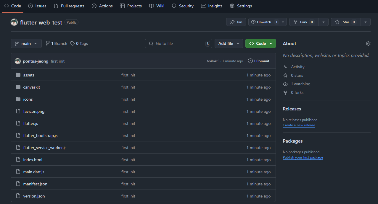 Flutter Web을 올렸지만, 단점이라고 하면 Web으로 빌드된 파일로만 처리해야해서 프로젝트 코드를 모두 올릴수가 없어서 관리가 어려운 문제가 있습니다.