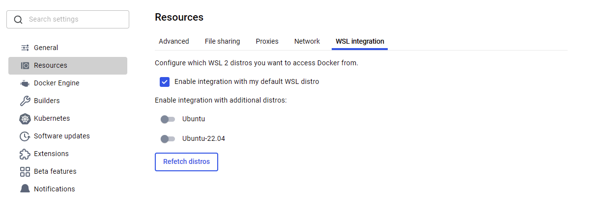 - WSL 통합 설정: Docker Desktop 설치 후, Settings > Resources > WSL Integration 메뉴로 이동합니다. "Enable integration with my default WSL distro"를 켜고, Docker를 사용하려는 특정 배포판(예: Ubuntu)의 스위치를 활성화해주세요. "Apply & Restart" 버튼을 누르면 설정이 적용되며, 이제 WSL 터미널에서