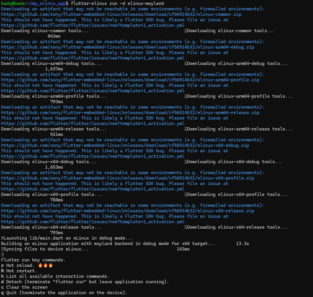 이 명령을 실행하면 flutter-elinux가 JSON 파일에 정의된 install과 runDebug 명령을 순서대로 실행하여 앱을 배포하고 디버그 모드로 실행해 줍니다.